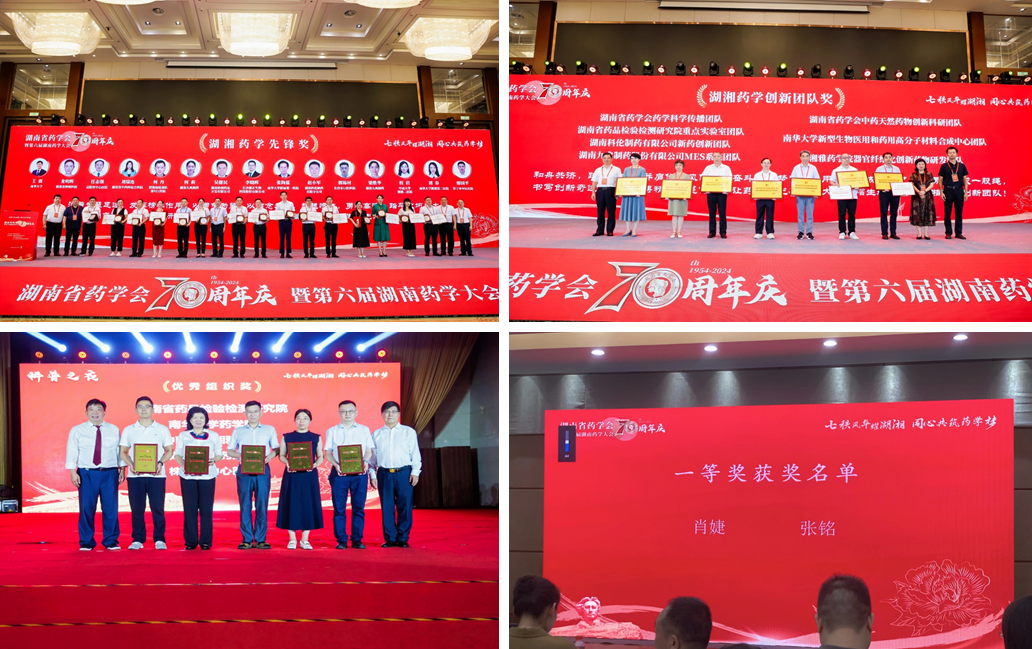 七月盛夏,燃梦药学。7月20日上午,湖南省药学会70周年庆暨第六届湖南药学大会在长沙开幕。本次大会以“七秩风华耀湖湘,同心共筑药学梦”为主题,旨在通过全省药学领域各专业的学术交流与合作,凝聚药学智慧,共襄药学盛举,助力湖南省药学事业高质量发展。此次大会颁发了多项重要奖项,表彰在药学领域做出了突出贡献的个人和集体。经湖南省药学会70周年庆典暨第六届湖南药学大会学员会组织评选,我院王震院长喜获“湖湘药学先锋奖”,我院魏华团队引领的南华大学新型生物医用和药用高分子材料合成中心获评“湖湘药学创新团队奖”,南华大学药学院获“优秀组织奖”。另外,我院硕士研究生张铭(指导老师:谢志忠)获得第六届湖南药学大会论文一等奖,张思怡(指导老师:王震)获得大会论文二等奖,黄红武(指导老师:贺冬秀)和赵紫玄(指导老师:许小丁)获得大会论文三等奖。