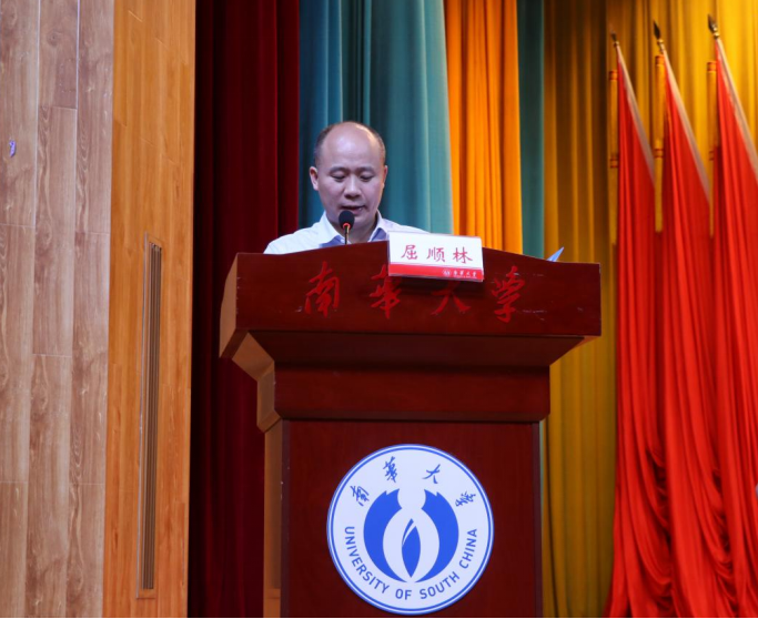 会议议程第二项,衡阳医学院常务副院长屈顺林致开幕词。屈院长首先代表学院对新生表达了热烈的欢迎,他向同学们介绍了最新的住培通过率情况,要求同学们加强在未来三年的求医深造道路上一是要加强医德修养,二是要树立创新精神,三是要积极应对AI时代的挑战,他最后勉励大家要以“国之大者”胸怀,扛起民族健康重任。