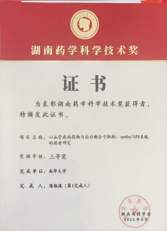 2025年6月,按照《湖南药学科技奖评审奖励章程》规定,经过湖南药学科技奖奖励评审办公室对申报材料的资格审核,专家函评,评审委员会综合评审,奖励委员会审定评审出2024年度湖南省药学科技奖获奖项目6项,予以公布。其中陈临溪教授带领的心血管分子靶标药理学新药创制团队以《心血管疾病药物与治疗新分子靶标,apelin/APJ系统的探索研究》项目荣获首届湖南省药学会2024年度药学科技奖三等奖。