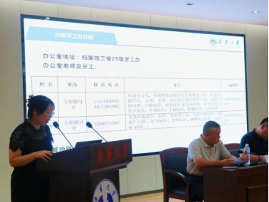 会议伊始,辅导员苏玲首先详细介绍了25级学工办的架构设置、班主任配置、朋辈辅导员的工作要求及下班党员的分工安排,并就班主任工作职责要求及考核进行了阐释。随后,她聚焦近期重点任务,对迎新流程细化、入学教育设计、宿舍文化建设等工作进行了具体部署,以“平安开学、精准识生、全面育人” 为核心目标,将新生报到的服务保障、军训期间的思想引导、入学教育的内容深化等关键环节有机串联,通过明确各队伍职责、建立协同联动机制,构建起覆盖新生从入学到适应的工作闭环,为后续新生教育管理工作的有序落地奠定了坚实基础。