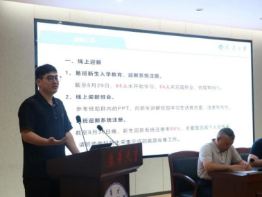 接着,辅导员夏泽华对迎新与资助重点工作展开讲解。在迎新方面,他明确学院以提升新生入学幸福感为目标,打造“缘聚南华迎新系列活动”,通过“寓见美好-宿舍送温暖”、“医路启航-师生见面会”等特色活动为抓手,搭建新生适应校园、融入集体的桥梁,同时采用“线上预热、线下跟进”的方式确保迎新各环节有序推进。在资助工作方面,他强调学院将始终坚守“入学无忧、资助先行” 的核心原则,切实做到“一个不掉队、一刻不犯愁”,让每一名新生都能安心开启大学旅程。