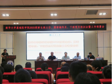 为扎实推进新学期学生工作开局,精准筑牢新生培养服务根基,南华大学基础医学院于 2025年8月 31日在医研楼一楼隆重召开 2025级新生班主任、朋辈辅导员、下班党员培训会暨工作部署会议。衡阳/基础医学院党委书记曾国、常务副院长屈顺林,基础医学院院长张晓东、党委副书记卢清华、副院长谢巍出席会议;2025级新生辅导员苏玲、夏泽华,2023级优秀班主任代表谭啸峰,以及全体 2025级新生班主任、朋辈辅导员、下班党员共121人参会。会议由辅导员苏玲主持,为新学期新生教育管理工作的有序开展奠定坚实基础。