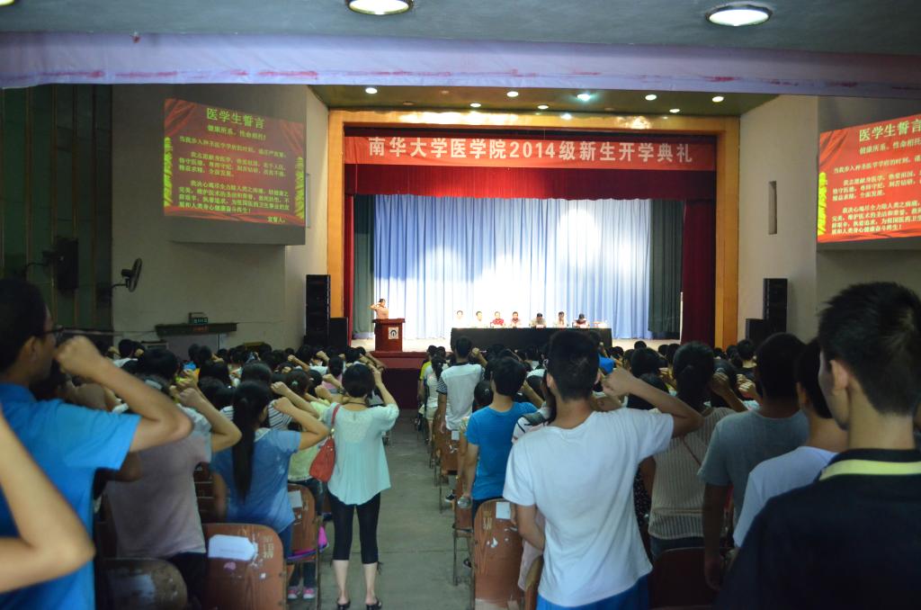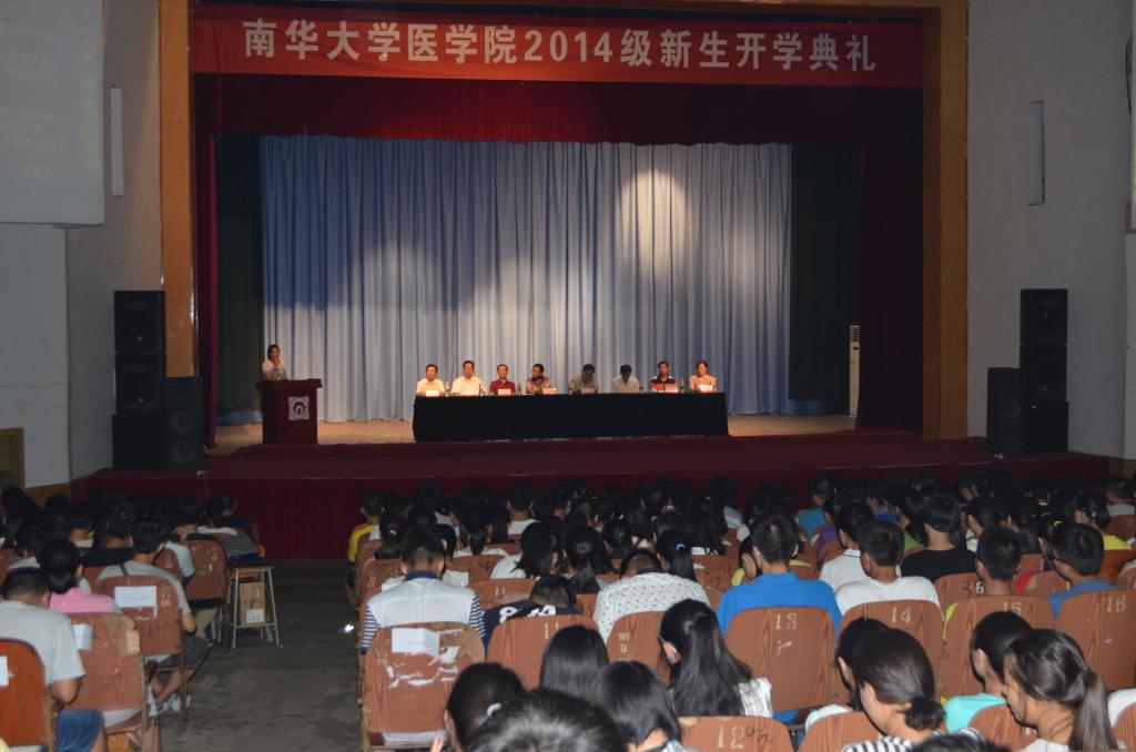 初秋艳阳高照,伴随着明媚的阳光,南华大学医学院迎来了刚刚步入大学殿堂的2014级的新生,为了让新生对大学的生活及学习有一定了解,医学院于9月7号上午10:00在南校大会堂举行了开学典礼。莅临本次大会的领导有医学院田英院长、院党委贺修胜书记、甘润良副院长、院党委刘小平副书记、桂庆军副院长、万炜副院长、院党委何战胜副书记、正处级调研员吕昌银教授,医学院全体辅导员老师、2014级全体班主任、班助和全体新生900余人参加了开学典礼。