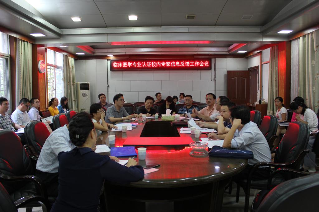 9月30日下午,临床医学专业校内预认证专家信息反馈会在医学院会议室召开。校长文格波、副校长阳小华出席会议并作重要指示。预认证校内专家、认证办全体人员、各相关学院和相关职能部门领导及脱产人员参加会议。会议由认证办主任田英教授主持。