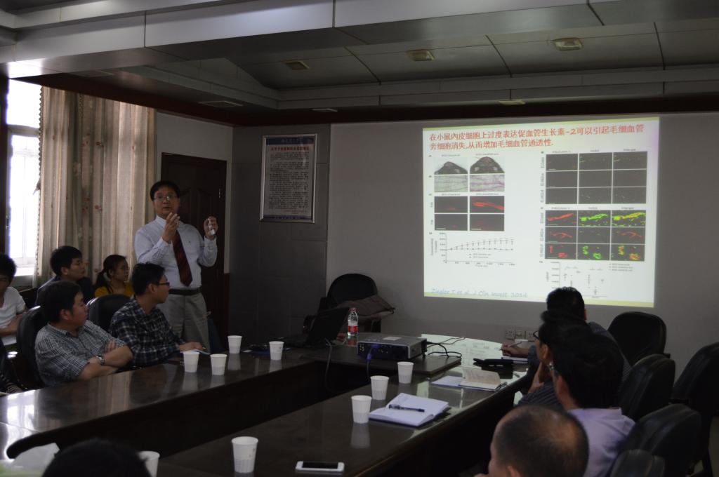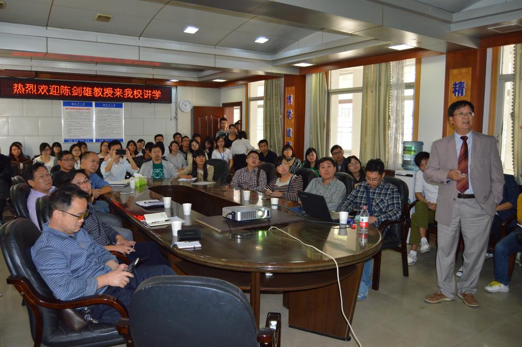 | 10月12号上午10:00,由南华大学研究生院主办,南华大学医学院承办的第九届研究生楚岳节博学篇学术讲座在医学院会议室正式拉开帷幕。由美国密西西比大学研究生院博士导师、湖南省百人计划学者陈剑雄教授为广大师生作了一场精彩的学术报告。医学院、药学与生物科学学院、公共卫生学院、护理学院等学院的研究生及部分老师参加了本次学术会议。学术报告会由医学院副院长桂庆军教授主持。 陈剑雄教授长期从事促血管生成素系统 (Angiopoietins/Tie-2)对新生的血管形成及心肌损伤修复的影响。在国际上首先发现并提出了 “糖尿病的新生血管不成熟稳定”的新颖观点, 该发现为糖尿病异常血管生成及糖尿病心肌病的治疗, 开发新的药物提供重要的实验基础。2011 年至 2013 连续三届获得密西西比大学医学中心优秀科研成就奖。先后主持完成了美国心脏学会和美国国家卫生研究院(NIH)科研项目 5 项,担任主持人科研经费达到 200 万美元. 发表 SCI 论文 40 余篇。他这次给我们作了“促血管生成素系统对败血症及其休克的诊断和治疗展望”学术报告,并就如何申请美国药理学博士学位作了简要介绍。最后,陈教授和在座的全体师生展开了热烈的讨论,许多同学向陈教授提出了学术性问题和临床问题,以及怎么申请到美国留学,陈教授一一给出了自己独特的见解。 陈剑雄教授系统全面的讲解,既有理论高度,又有实践意义,他严谨的治学态度和雄厚的理论功底让听众由衷的产生敬意,不仅激发了同学们的学习科研热情,而且启迪了大家的创新思维。整场报告会持续了二个小时,报告会在浓郁的学术氛围中落下帷幕。 |