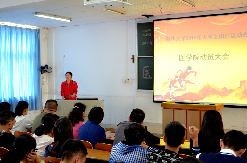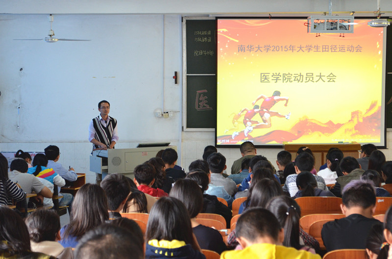 10月28日中午,医学院2015年大学生田径运动会动员大会在五栋104教室隆重召开,医学院党委副书记何战胜出席并作动员报告。医学院各年级辅导员老师、团学干部、各班班长团支书以及全体运动员共计260多人参加了动员大会,会议由院团委书记曾长虹老师主持。