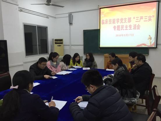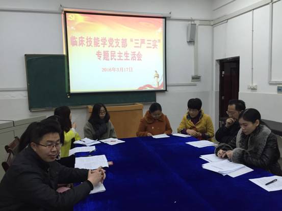 根据学校党委《关于召开基层党支部“三严三实”专题组织生活会和深入开展民主评议党员工作的通知》的精神和要求,3月17日晚,医学院临床技能中心党支部在新二教三楼会议室召开了“三严三实”专题教育组织生活会,会议由临床技能中心党支部书记唐志晗主持,党支部全体党员参加会议,医学院党委副书记何战胜到会指导。