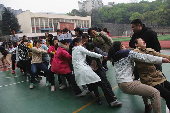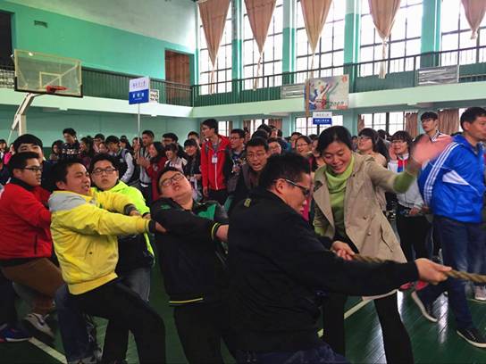 3月26日上午九点,2016年南华大学大学生拔河比赛在南校篮球场举行,医学院党委副书记何战胜老师、院团委副书记周忠策老师、2013级辅导员黄朝晖老师亲临现场,为医学院拔河队加油打气。