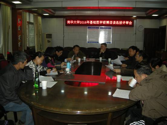 4月7日下午3:00,在医学院会议室举行2016年基础医学选拔在读优秀硕士生硕博连读攻读博士学位研究生评审会。会议由南华大学医学院桂庆军副院长主持,基础医学硕博连读选拔工作专家小组8位博导、学科带头人参加评审面试。