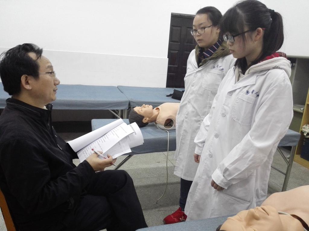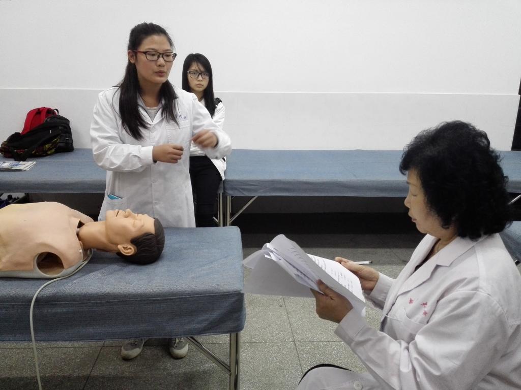 4月26日晚19:30,由医学院团委科技部主办的医学院急救技能比赛在新二教A栋414教室举行,来自医学院21名学生参加了此次比赛。比赛流程分为心肺复苏操作和知识竞答两个环节。每四人为一组同时进行比赛,由评委老师根据参赛人员的操作和答题情况进行评分,最后按得分高低取一等奖1名、二等奖1名、三等奖3名。南华大学临床技能中心主任王汉群副教授、南华大学诊断学教研室王北冰副教授担任评委。