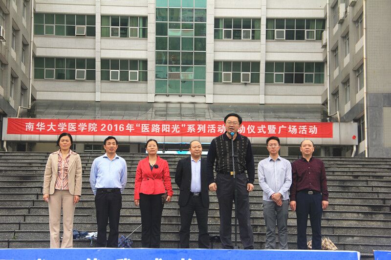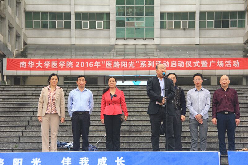上午8:00启动仪式开始。首先,由刘安元副书记带领全体师生齐诵《医学生誓词》“健康所系,性命相托……”虽然天空下着小雨,但是在场的医学生紧握右拳,目光坚定,语言铿锵有力,用响亮的声音表达对祖国医学事业的无比忠诚。仪式第二项,何战胜副书记介绍活动实施方案:2016年4月—12月,学院以“医路阳光”为主题,深入开展创建“医品牌”特色活动,活动分为三个阶段进行;整合现有50项团学活动资源,按照“明德篇、博学篇、求是篇、致远篇”提炼分类,强化内涵,突出特色;通过开展争创“医品牌”特色活动,在此基础上逐年进行持续改进,形成“以医品牌为主,促进全面发展”的医学院学生工作特色。仪式第三项,学生代表吴宇鹏上台发言,他倡议:全院同学树立高度的社会责任感和使命感,用实际行动积极争创“医品牌”,切实提高自身综合素质,为南华大学、南华大学医学院增光添彩。仪式第四项,刘升学副校长做重要讲话,他高度评价了医学院在学生工作方面取得的突出成绩,及医学生在国家、学校开展的各项竞赛和活动中的优异表现。他指出:“医路阳光”活动很好地结合医学院学生工作特点,希望全院师生积极参与,创出特色,打造“医品牌”,在引导大学生成长成才方面发挥更加积极的作用,祝愿“医路阳光”系列活动取得圆满成功。最后,陈熙院长宣布南华大学医学院2016年“医路阳光”系列活动正式启动。