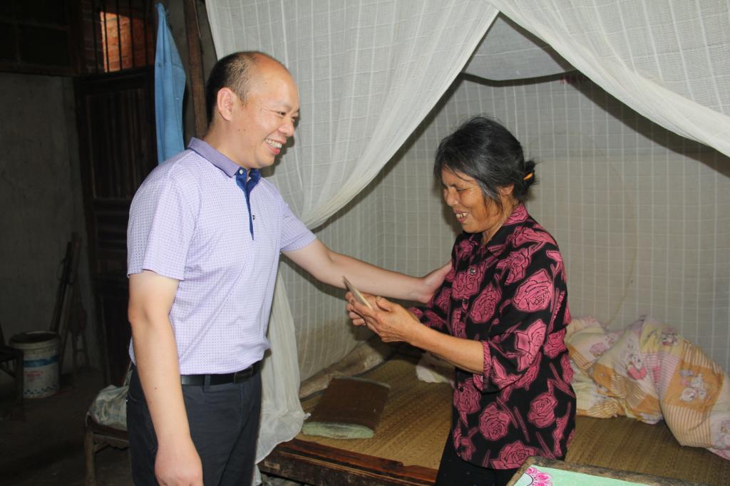 与此同时,服务团老师刘安元、周忠策、黄朝晖、李熠携领部分同学走访了村里五组特困户,为他们上门进行义务医疗检查,包括测量血压、基本情况问诊等。医学院党委副书记刘安元代表服务团全体队员表示亲切慰问,并送去爱心帮扶款。