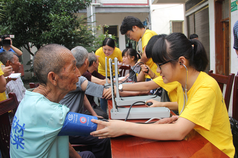 上午9:00,在学院领导的指导下,师生们为老人们进行健康检查,包括测量血压、心跳、身高、体重等。同时,队员们热情地与老人聊天,引导老人填写调查问卷,并向老人们普及老年人常见疾病以及急救的相关知识。由于部分老人语言不通加上年老耳背,队员们三两成组,语言与手势并用,与老人们艰难却又愉快地沟通,现场场景一片温馨,展现了医学生良好的人文素养。