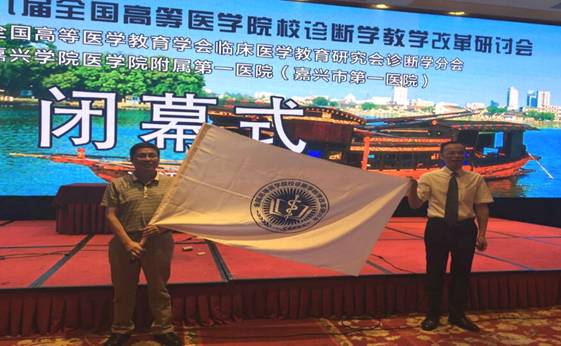 会上,我校桂庆军教授与尹凯副教授就下届全国高等医学院校诊断学教学改革研讨会的举办权进行了申报陈述,展示了我校为举办下届年会所作出的充分准备。经大会表决,我校从几所拟申报高校中脱颖而出,获得第20届全国高等医学院校诊断学教学改革研讨会的举办权。闭幕式上,桂庆军教授与本届大会执行主席进行了会旗交接,并致辞欢迎全国各大院校老师参加明年在雁城衡阳举办的全国诊断学年度盛会。