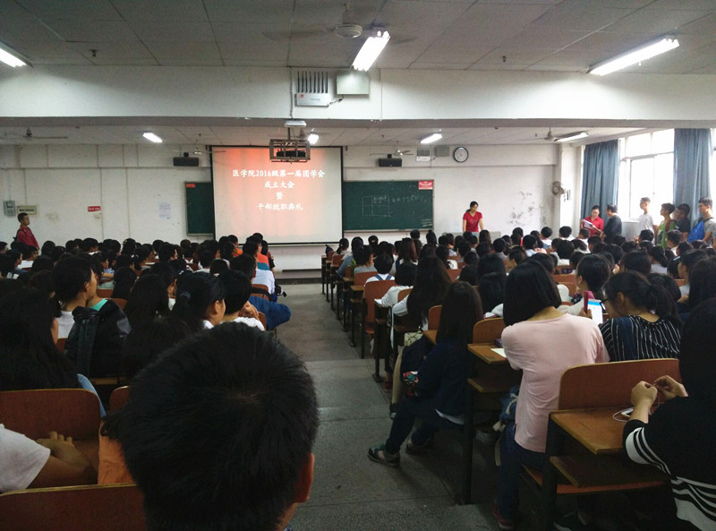 10月8日下午16:30,医学院2016级第一届团学会成立大会暨干部就职典礼在红湘校区第一教学楼212举行。出席典礼的嘉宾有医学院党委书记尹检龙、党委副书记何战胜、2013级学生党支部书记周君仪、2015级学生党支部书记蒋芳香、2016级年级辅导员刘永忠老师,参加典礼的还有2016级团学会全体成员、班团干部。会议分为成立大会和干部就职典礼两个阶段,由2016级学生党支部书记徐婵娟老师主持。