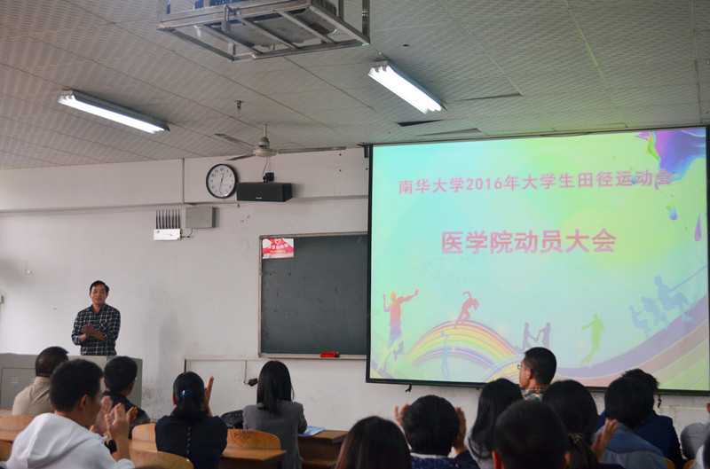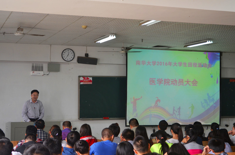 10月11日中午12:30,2016年南华大学大学生田径运动会医学院动员大会在1—311教室召开。参加大会的有医学院全体辅导员、院团学干部、各年级班长团支书及全体运动员,医学院院长陈熙、党委书记尹检龙、副书记刘安元出席了此次大会。会议由副书记何战胜主持。