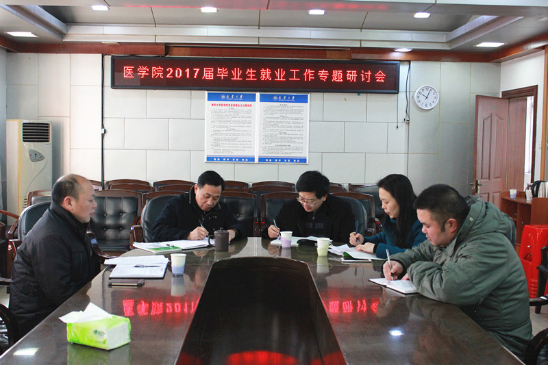 2月13日上午,医学院党委书记尹检龙、院长陈熙、副书记刘安元、2012级党支部书记佘雅、辅导员段元润、2013级辅导员黄朝晖在医学院会议室召开2017届毕业生就业指导研讨会,会议由尹检龙书记主持。