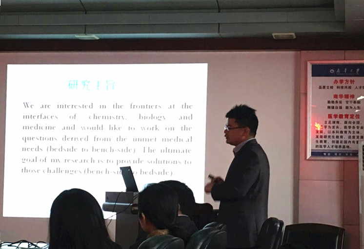 33月23日下午,由南华大学人事处、科技处和医学院主办,题为“毒品神经化学生物学”的学术报告在南华大学医学院会议室举行。中国科学院百人计划、长春应用化学研究所研究员、课题组组长、博士生导师王晓辉博士应南华大学医学院生理学教研室和神经科学研究所邀请开展了此次学术活动。南华大学副校长姜志胜教授出席学术报告会,来自医学院、公共卫生学院、药学与生物科学学院以及临床医学学院的教师、研究生、本科学生共60余人与会,学术报告会由医学院院长陈熙教授主持。