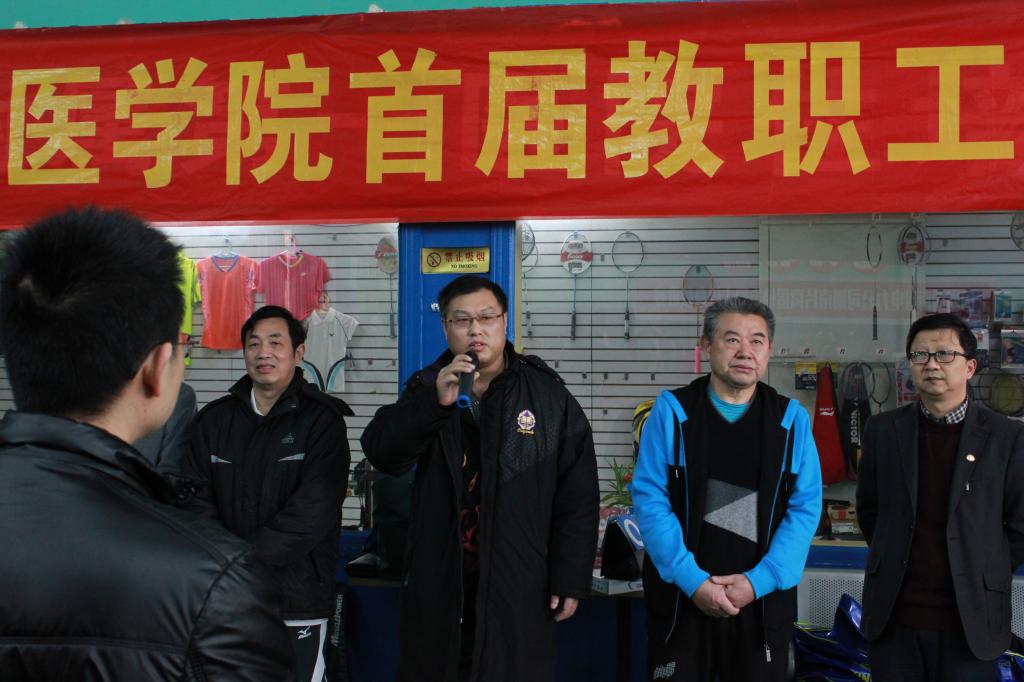 3月26日上午,由医学院分工会举办的首届教职工羽毛球比赛在衡阳市实验中学羽毛球馆举行,来自全院6支代表队的36名运动员参加了比赛。赛前进行了简短的开幕式,首先陈熙院长致开幕词,副校长姜志胜、校工会常务副主席李双极作了简短而热情的讲话,接着总裁判长李军宣布比赛规则,裁判员代表彭旌宇、运动员代表赵飞骏分别宣誓,最后由文格波教授宣布比赛开始。开幕式由院分工会主席桂庆军主持。