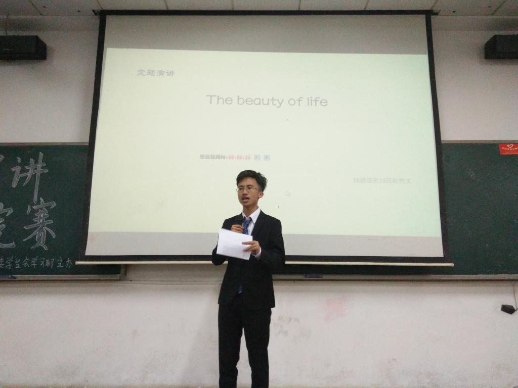 比赛在主持人全英文开场白中拉开了序幕。本场比赛分三组进行,选手的演讲分为两个部分:首先,每个选手以“If by life you were deceived(假如生活欺骗了你)”为主题进行演讲;然后各选手随机抽取演讲主题进行即兴演讲。选手们以自己的经历为例,将生活的激情分享给在座观众。其中,9号选手王祎滴,演讲时突然忘记赛前重复背诵的稿件内容,面对这样的情况,她以爽朗笑声化解了现场的尴尬,为我们现场诠释了“假如生活欺骗了你,不要悲伤,不要着急”的名句。同时,她乐观的行为也换来了观众热烈的掌声。“If by life you were deceived,juest dance in shackles”假如生活欺骗了你,那就带着镣铐跳舞吧!参赛选手蔡皓冰如此对在场的各位说,其生活睿智可见一斑。比赛为缓解赛场的紧张氛围,在第一、二组演讲完毕后还分别进行了一轮互动环节,为比赛增添了不少乐趣。