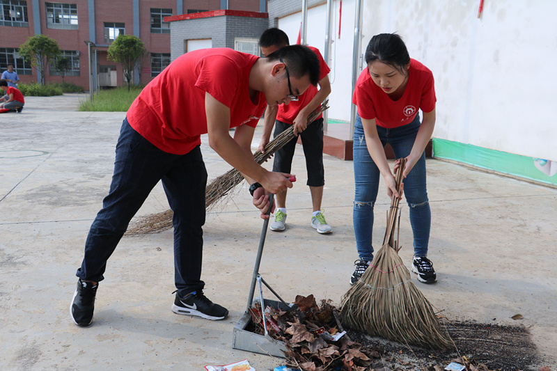 当天,志愿者前往当地的阳坳小学,在学校操场、升旗台、教学楼等地开展大扫除活动。骄阳似火,志愿者们发扬不怕苦、不怕累的精神,经过3个多小时的劳动,整个学校焕然一新,为即将开学的孩子们营造了一个整洁干净的校园环境。