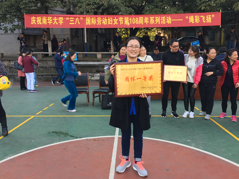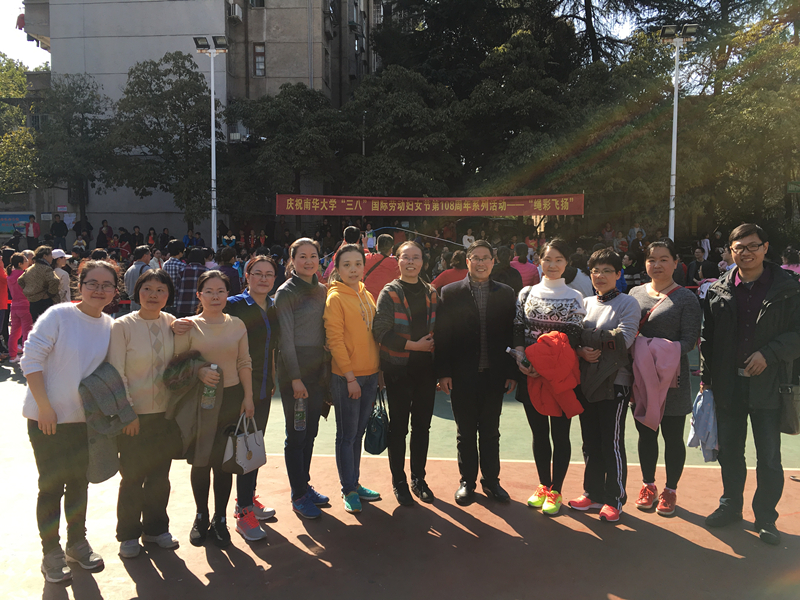 为庆祝“三八”国际劳动妇女节第108周年,校工会于3月10日下午15:00在红湘校区南校灯光球场举行了女教职工“绳彩飞扬”团体跳绳比赛。医学院分工会组成了以副院长桂庆军为领队,副处级调研员黄祁平为教练,院办公室主任洪丽为队长,队员包括高天舒、佘雅、唐雅玲、肖国华、粟盛梅、唐双阳、赵兰华、伍虹蓉和康颖共12人的代表队参赛,经过激烈的角逐,最终夺得团体比赛一等奖的好成绩,为学院争得了荣誉。