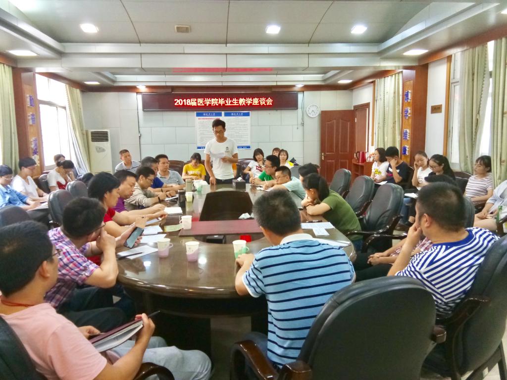 6月8日下午,医学院2018届毕业生教学座谈会在医学院会议室召开。本次会议由医学院副院长唐志晗主持,院党委副书记何战胜、医学部科教科科长谢巍、医学院各教研室负责人及相关负责人员应邀参会,医学院2013级各专业毕业生代表参加本次会议。