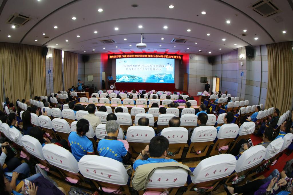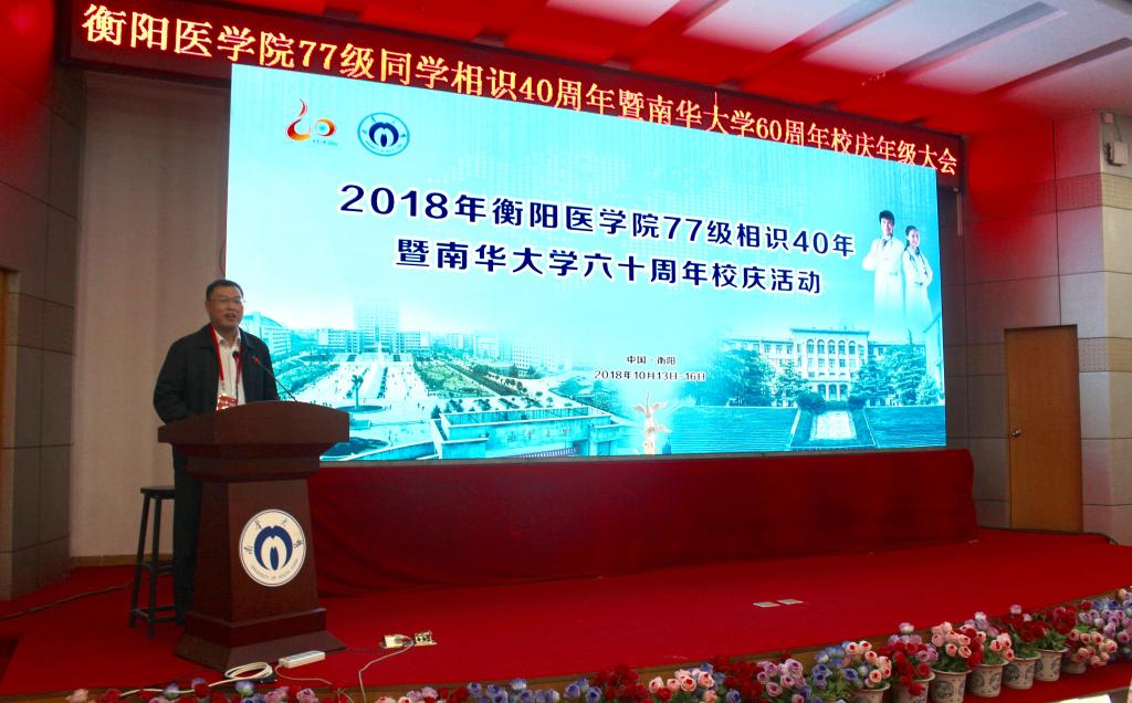 10月14日,衡阳医学院77级校友从四面八方回到40年前相识求学之地——南华大学,欢聚母校,共话未来。校友们在图书馆学术报告厅举行年级大会。南华大学副校长、衡阳医学院党委书记兼院长姜志胜应邀出席,77级教师代表杨永宗、张毅、曾明新等13位教师受邀参加会议,会议由77级校友何淑雅主持。