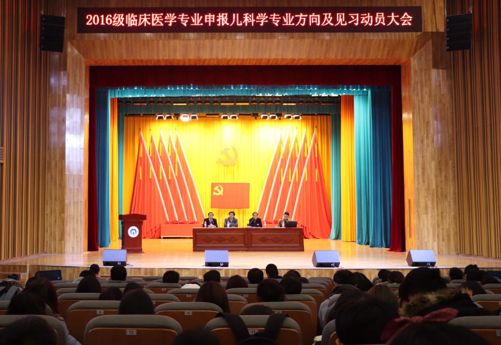 为缓解儿科医生缺乏的紧张现状,加强临床医学专业学生对儿科学专业方向的深入认识,同时明确临床见习的目的和意义,及推进见习工作的顺利开展。衡阳医学院于12月6日中午在南校学术报告厅召开2016级临床医学专业申报儿科学专业方向及见习动员大会。湖南省儿童医院科教部主任朱晟、本儿科方向班主任田甫翠,衡阳医学院党委常务副院长陈熙、副书记陈端阳、副院长桂庆军、2016级辅导员徐婵娟、周玉林、刘永忠以及教学办的老师出席了此次大会,与会人员为2016级临床医学专业全体学生。会议由桂庆军主持。
