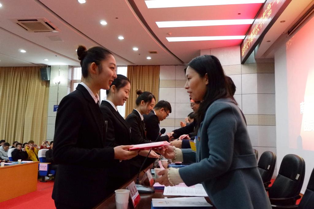 会议第三项,由桂庆军、何战胜分别宣读优秀干部表彰名单和新一届团学干部名单,紧接着,主席台领导向优秀学生干部颁发荣誉证书,为新一届团委学生会干部颁发聘书。会议第四项,校学生会代表石柳、新任学生会主席曾雨成分别致词。