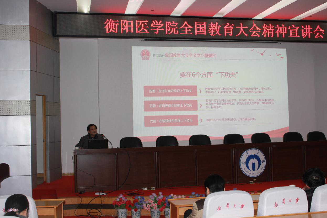陈端阳书记从全国教育大会的重要意义、学习精髓等方面宣讲了全国教育大会的主要精神,要求学院全体干部职工要以全国教育大会精神和新时代全国高等学校本科教育工作会议主要精神为指导,结合《南华大学深化医教协同加快推进医学教育改革发展的实施方案》,一定要在学校深化医教协同加快推进医学教育改革发展的明确指导思想、工作目标和针对的问题的基础上,在《南华大学深化医教协同加快推进医学教育改革发展的实施方案》的六大工程30项任务和新医科建设、全面提升人才培养质量、医教研协同、保障经费投入、加强资源整合做工作。最后,陈端阳书记希望全体教职工以“勤奋求实、博学维康,德术并重、精诚合一”为信念,努力提高医学教育办学质量和综合实力,力争早日实现南华大学医学教育进入国内高校先进行列这一目标。