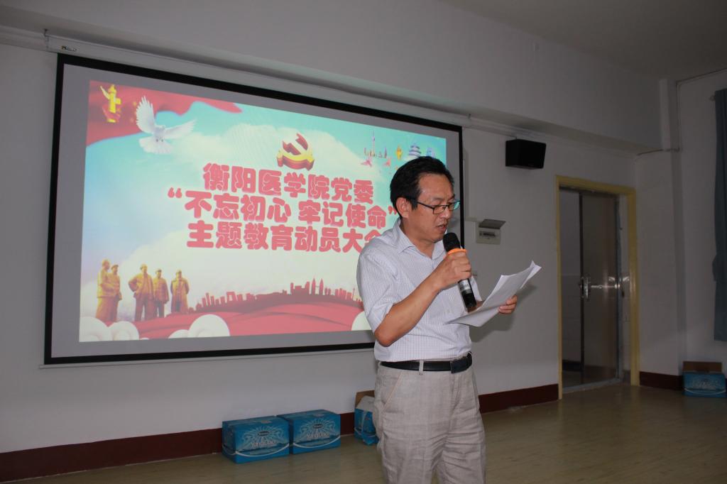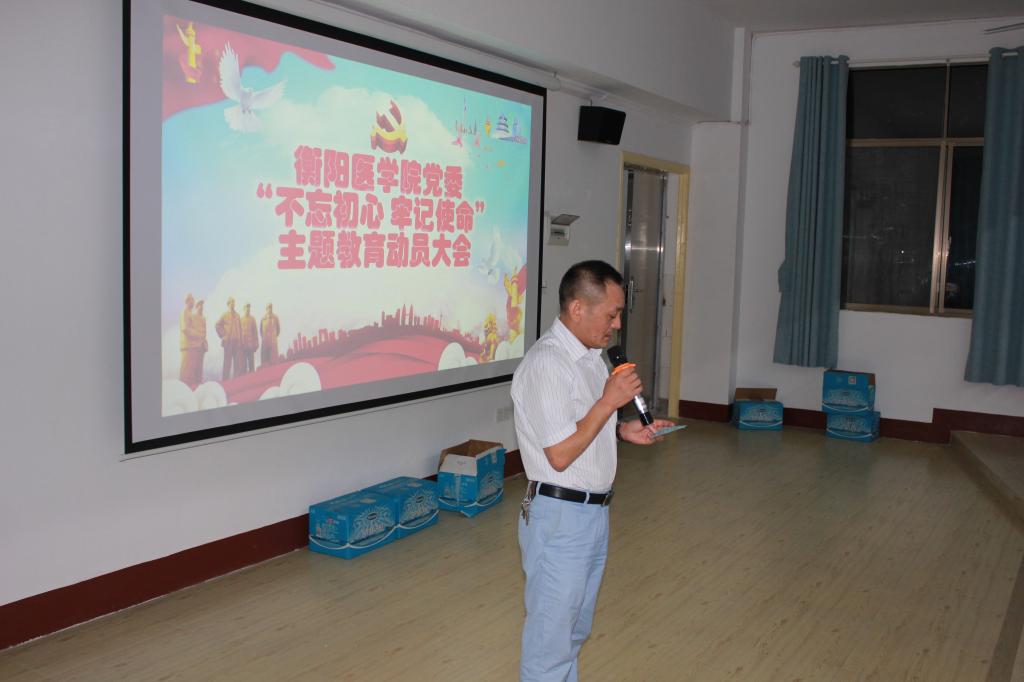 2019年9月23日晚八点,衡阳医学院党委在3教201教室举行了“不忘初心,牢记使命”主题教育动员大会。会议由衡阳医学院党委常务副书记陈端阳主持,校机关党委书记、组织部副部长、主题教育指导联络组组长兼第一联络组小组长简世德、衡阳医学院副院长曾国、衡阳医学院副院长唐志晗、衡阳医学院全体党员及科室负责人参加了此次大会。