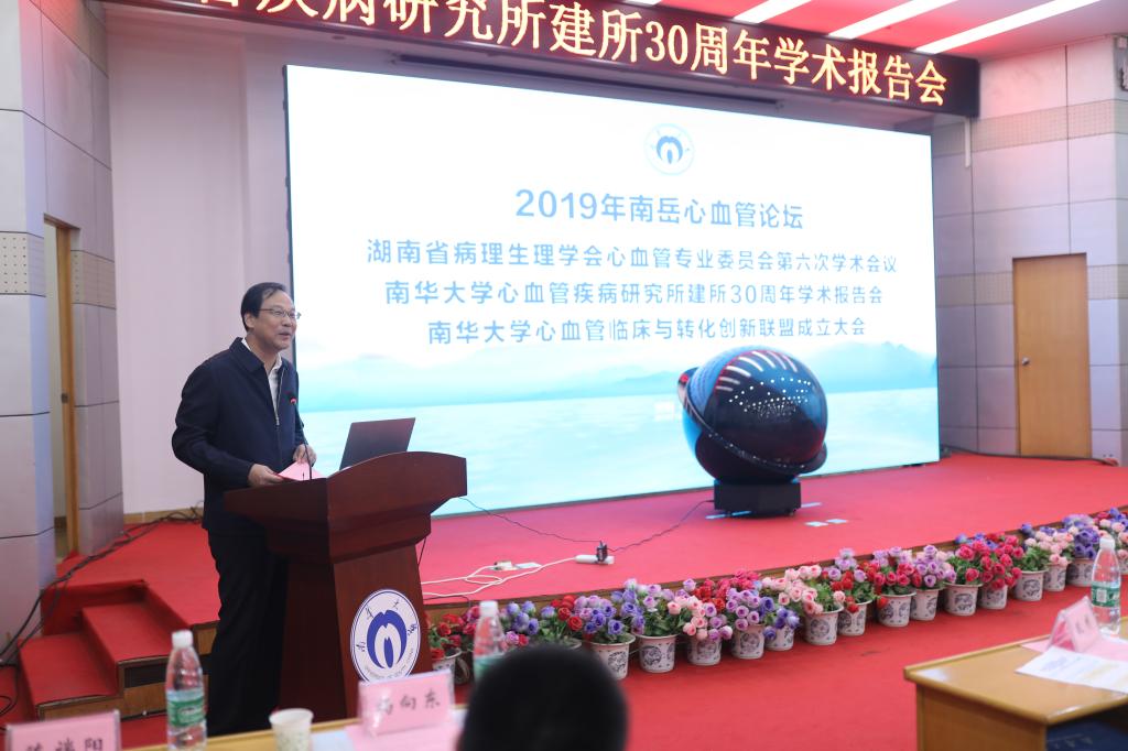 2019年10月12日,由湖南省病理生理学会心血管专业委员会、南华大学衡阳医学院、动脉硬化学湖南省重点实验室、动脉硬化性疾病湖南省国际联合实验室联合主办的2019年南岳心血管论坛暨湖南省病理生理学会心血管专业委员会第六次学术会议,以及南华大学心血管临床与转化创新联盟成立大会和南华大学心血管疾病研究所建所30周年学术报告会在南华大学成功举行。南华大学副校长兼衡阳医学院院长、湖南省病理生理学会心血管专业委员会主任委员、南华大学心血管临床与转化创新联盟主席姜志胜教授担任大会主席。南华大学心血管疾病研究所所长刘录山教授主持开幕式。我国著名的心血管病理生理学家唐朝枢教授、湖南省卫生健康委员会副主任祝益民教授、南华大学校党委书记高山教授、湖南省病理生理学会副理事长兼秘书长王慷慨教授、南华大学心血管疾病研究所首任所长杨永宗教授和南华大学衡阳医学院陈端阳常务副书记等应邀出席大会开幕式。参加会议的有来自全省各地近200名临床医师、高校教师和研究生,南华大学部分医学本科生也聆听了会议。