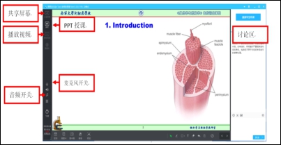 组织学与胚胎学是一门重要的医学基础课,属于形态学范畴,其线上教学受到了多方面因素的制约。例如在开课初期教师们先后尝试了“超星直播”和“雨课堂”等多个平台,但是发现学生无法看到老师鼠标所指的结构,不利于学生学习和掌握形态结构。经过多方面对比,教师们发现“腾讯课堂”和QQ屏幕分享的直播,可以弥补这一缺陷,于是使用腾讯课堂(极速版)进行直播授课。腾讯课堂授课可以充分发挥四个方面的功能:一是PPT授课功能;二是视频播放功能;三是屏幕共享功能;四是在讨论中输入文字与学生交流功能(图1)。此外,还可以音频开关按钮向学生播放教学音频。