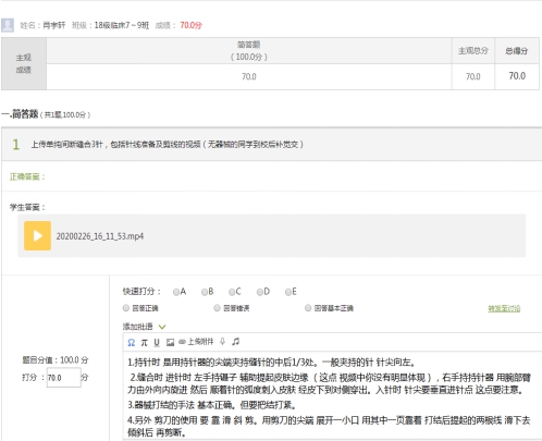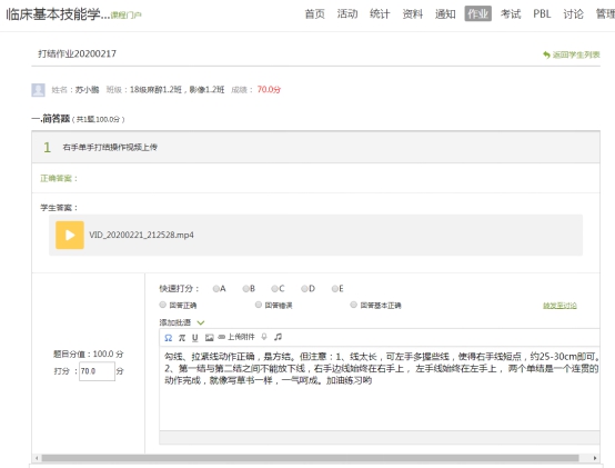 四是遵循教学规律,严格示范解疑,奏响线上授课“标准音”。外科基本技能操作既有规范又有经验,但经验必须以规范为前提。在网络线上教学另类的“面对面”“手把手”情形下,如何把基本操作教得规范,教师们的做法是:要求学生以网上的录像、视频作为参照,结合老师的线上讲解内容,亲手完成“作品”,并将“作品”上传到学习通作业板块;教师及时对学生发来的操作视频逐一进行点评纠正,若学生对某一学习内容存在不解,则及时通过微信、学习通等平台在线提问,教师在线解答,或提供正确示范,尽可能做到学生对学习“零疑惑”,减少或避免“误操作”。教师要求,此前学生学的每一项基本技能,学生返校后还要进行过关测验和强化训练,保证线上教学与线下强化有机衔接。