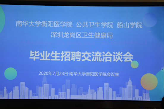 7月23日下午,深圳市龙岗区卫生健康局调研员汤隆斌、一行7人莅临南华大学衡阳医学院,就推进全科医生和公卫医生招聘工作进行洽谈交流。洽谈会在衡阳医学院会议室召开。学校招就处副处长李先国、衡阳医学院党委常务副书记陈端阳、党委副书记何战胜、船山学院副院长尹小波、公共卫生学院党委副书记王超,衡阳医学院部分辅导员和研究生出席会议。会议由何战胜主持。