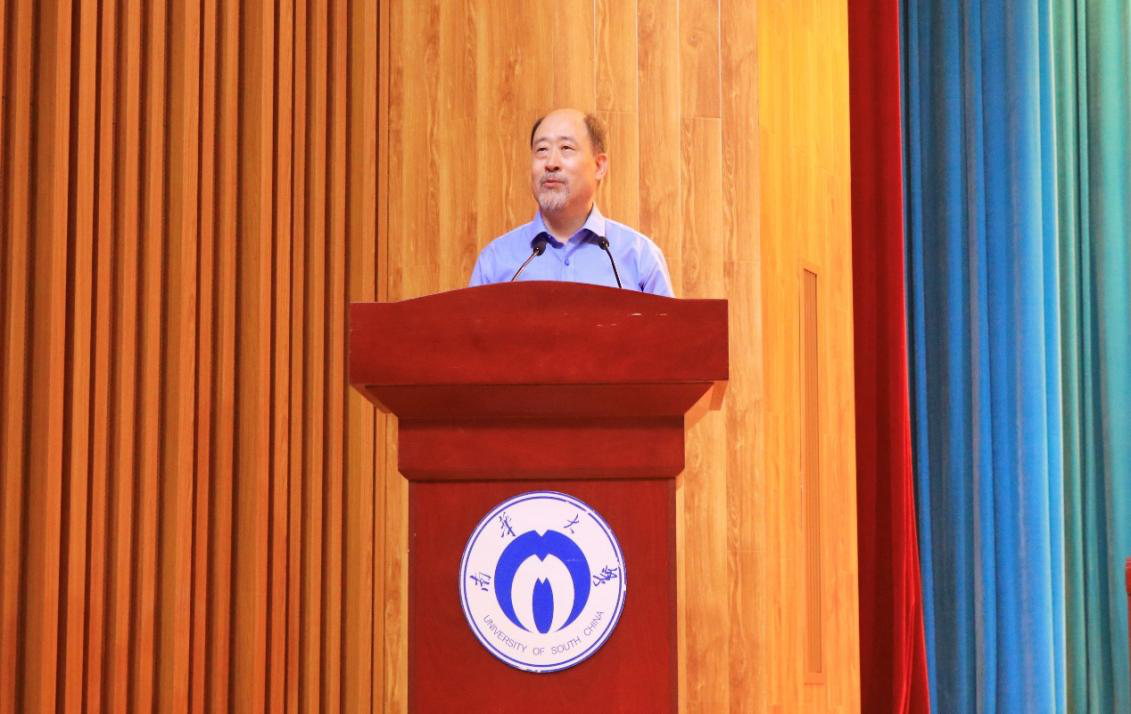 随后,南华大学高层次人才吕斌教授为新生们作了“如何开展高水平的科学研究”的专题报告。吕斌教授从自己的科研经历切入,深入浅出地讲解了作为新生该如何接触并开展科研这一新生最为关注的问题。他劝勉各位新生要真正做到心无旁骛,不为科研之外的事情所困扰。