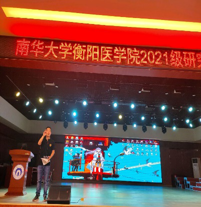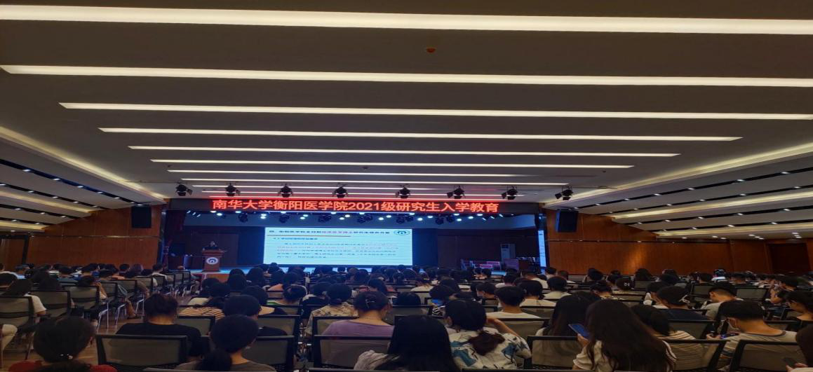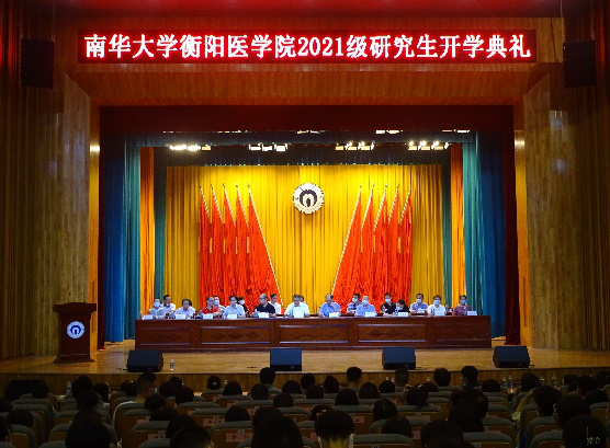 2021年9月9日晚上7:30,南华大学衡阳医学院在南校大礼堂举办了衡阳医学院2021级研究生新生开学典礼。莅临开学典礼的领导有南华大学党委委员、副校长、衡阳医学院党委书记姜志胜,南华大学校务委员会副主任、衡阳医学院院长王福俤,校本部各医科类学院及南华大学附属第一医院、附属第二医院、附属南华医院领导参加。教师代表、研究生辅导员、各学院学科与科研办公室教师和衡阳医学院2021级全体研究生共550余人参加。开学典礼由姜志胜主持。