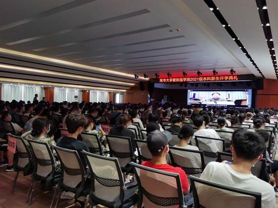 9月12日下午,南华大学衡阳医学院2021级新生开学典礼在主会场红湘校区大会堂和分会场北校活动中心举行。南华大学党委委员、副校长兼衡阳医学院党委书记姜志胜,南华大学校务委员会副主任兼衡阳医学院院长王福俤出席,学校高层次人才代表容益康教授、陈智毅教授,全国优秀教师让蔚清教授,优秀校友湖南省儿童医院(南华大学儿科学院)院长肖政辉教授参加,校本部医科类学院全体院领导、2021级全体班主任及辅导员、2021级全体学生共1300余人参加典礼。开学典礼由姜志胜主持。
