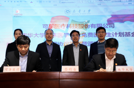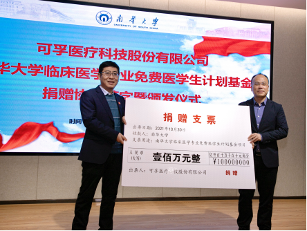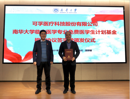 随后,招就处副处长、校友会秘书长李先国与可孚医疗科技股份有限公司人力行政总监欧阳杰签署捐赠协议。可孚医疗科技股份有限公司向衡阳医学院捐赠一百万元人民币,用作免费医学生项目的资金。衡阳医学院副院长王震代表衡阳医学院接受捐赠并向张志明颁发捐赠证书。可孚医疗科技股份有限公司领导、南华大学领导为10名获奖学生代表颁发免费医学生计划基金。