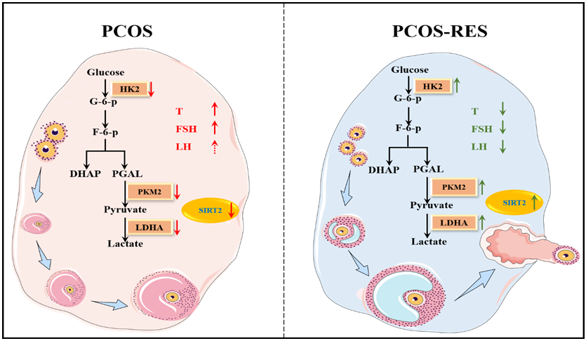 该研究利用来曲唑联合高脂饲料喂养构建PCOS大鼠模型,并采用白藜芦醇对其干预。结果发现,白藜芦醇可改善PCOS大鼠卵泡发育障碍;靶向能量代谢及转录组学结果发现,PCOS大鼠卵巢糖酵解紊乱,关键限速酶表达降低,经白藜芦醇干预后卵巢糖酵解紊乱得到显著改善,限速酶基因表达升高。该研究提出了糖酵解异常是PCOS卵泡发育障碍的重要原因,更深层次地揭示了白藜芦醇调控糖酵解通路改善PCOS卵泡发育障碍的分子机制,这为改善临床PCOS患者卵泡发育障碍和白藜芦醇的应用提供了新的治疗策略和药物靶点。