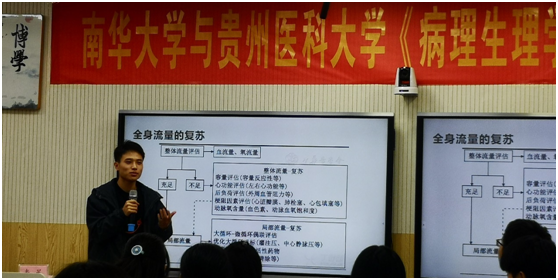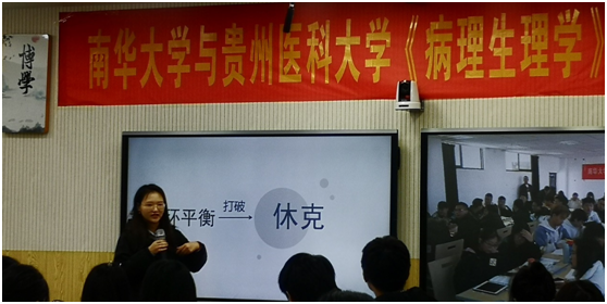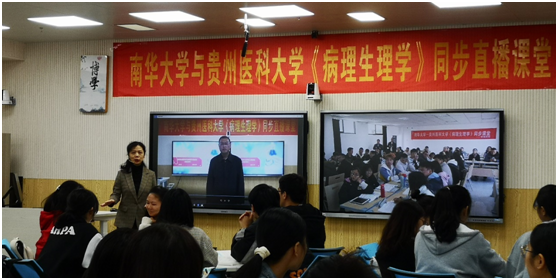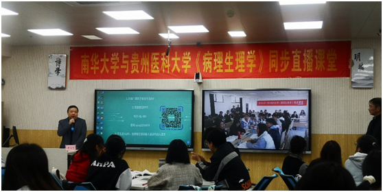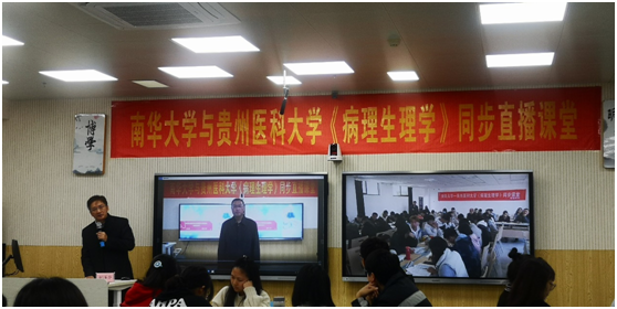 南华大学副校长、衡阳医学院党委书记、课程负责人姜志胜教授借助视频送来寄语:“借助网络与智慧树线上平台,将南华大学《病理生理学》课程原汁原味地隔空“搬”到贵州医科大学,使远在700公里外的贵州医科大学的同学们不仅能与南华大学的学子同步上课,还能一起参与课堂讨论。“慕课西行”现已开启2.0时代,以共享一流课程与名师课堂为特征、以学校或学院为单元、以开课团队和选课团队紧密合作为关键、以“政策牵引、精准合作、多元互动、注重实效”为特征的新阶段转变。此次南华大学与贵州医科大学“同步课堂”的开启,是我校积极响应教育部“慕课西行”号召的具体行动,采用“同步课堂”教学方式与贵州医科大学开展首次直播同步授课,两地的同学们将跨越千里进行“云互动”,互促互学,共同进步。”