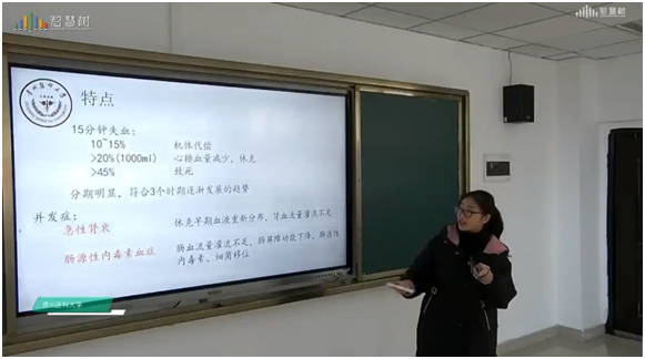 2021年11月10日10时30分,在南华大学红湘校区南华楼405智慧教室,一堂特殊的课程正在生动开讲。南华大学基础医学院病理生理学教研室韦星老师为南华大学与贵州医科大学的医学生们献上了一堂“跨校远程直播”《病理生理学》课程。通过智慧树(东西部高校课程共享联盟)的跨校直播互动网,来自南华大学的42名学生,与贵州医科大学的32名学生分别坐在各自学校的教室里,在韦老师的讲授与引导下针对休克的处理目标及其病理生理学基础进行学习探讨。两地学生踊跃发言,参与互动,深入交流,课堂气氛活跃。