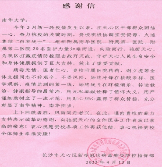 3月中旬,国内新一轮疫情频发,长沙市全面开展多轮区域核酸检测及隔离管控,时间紧、任务重、人员缺。学校从附一、附二和附属南华3家附属医院抽调20人组成医护队到长沙市天心区支援抗疫。经过一个月的艰苦奋战,医护队圆满完成了抗疫支援任务,赢得了天心区干部群众的高度肯定和赞扬,为此,长沙市天心区疫情防控指挥部特意写信向学校表达感谢。