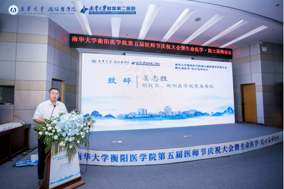党委委员、副校长、衡阳医学院党委书记姜志胜致辞代表学校与衡阳医学院,向第五届医师节受表彰的医生们表示热烈的祝贺,向救死扶伤、教书育人,坚守在临床医疗教学与科研一线的医生们致以崇高的敬意。他总结了一年来衡阳医学院取得的成绩,并提出了附属医院改革发展的三点意见:一是坚持党建引领,推进党风廉政建设;二是加强法制保障,推进医德医风建设;三是不断深化改革,促进医院高质量发展。