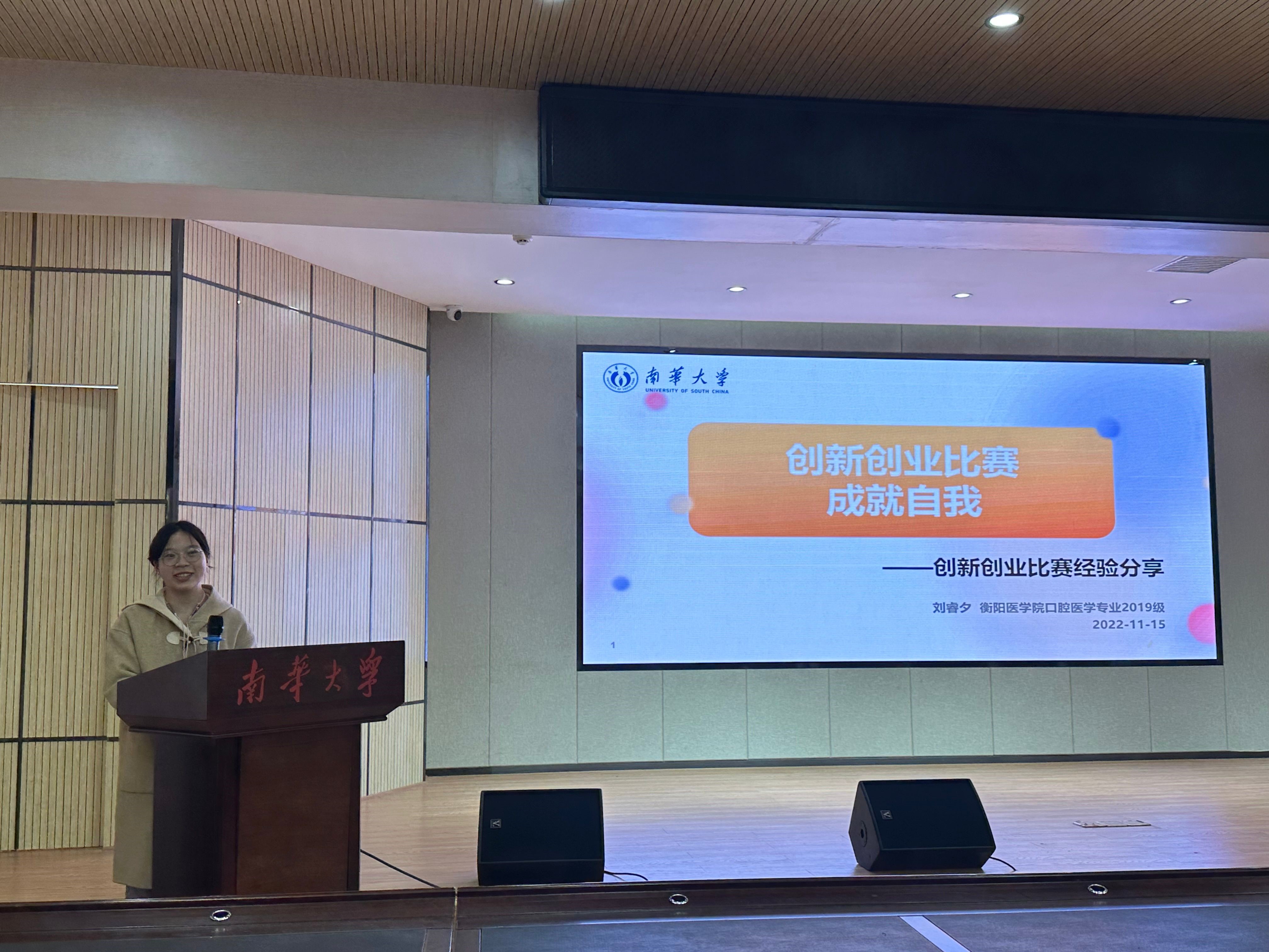 衡阳医学院“医”往无前创新创业团队代表刘睿夕同学通过“创新创业比赛,成就自我”的讲座,结合自己3年来参赛的经历,分享了自己的心路历程和经验体会。她鼓励同学们积极参加比赛并结合自身列举了大学生参加学科竞赛的益处,参加学科竞赛不仅可以增强专业能力、提升专业素质,还能培养大学生学以致用、团结协作的精神和提高分析处理问题的能力,最终学以致用,成就自我,促进自身综合素质的提高。