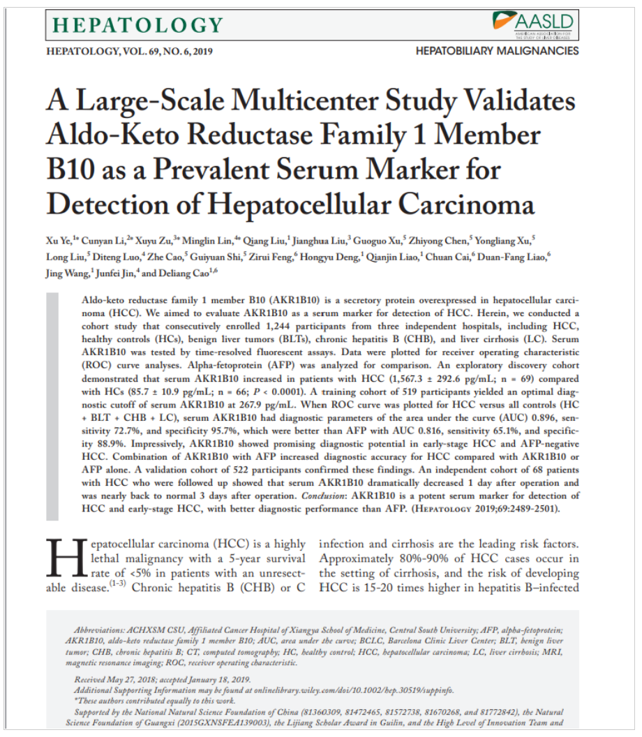 2019年,AKR1B10蛋白作为新型肝癌血清标志物的研究成果发表在国际肝病学领域经典、权威期刊《肝病学》(《Hepatology》)上