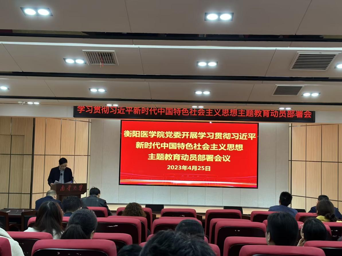 4月25日下午,南华大学衡阳医学院学习贯彻习近平新时代中国特色社会主义思想主题教育动员部署会议在医研楼报告厅召开。衡阳医学院党委书记曾国主持并作动员部署讲话。衡阳医学院全体院领导、党支部书记、科室主任和教师党员代表参与本次会议。