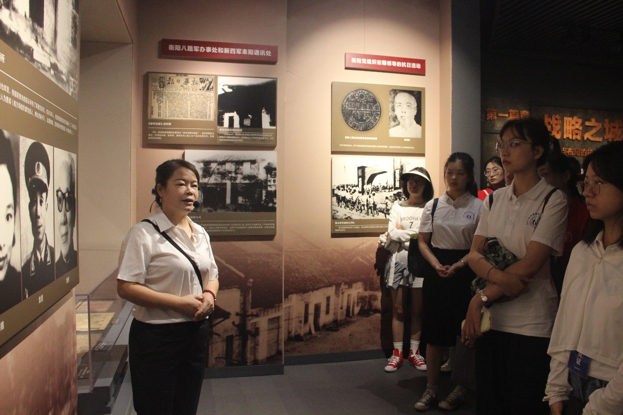 研究生暑期学校学员一行人来到衡阳抗战纪念馆。衡阳抗战纪念馆位于衡阳市岳屏公园西北面。在岳屏公园后山的抗战纪念碑处,同学们细细品读碑座浮雕,瞻仰碑柱刻字,认真阅读先烈事迹。一进入衡阳抗战纪念馆,映入眼帘的便是“血染衡岳”主题雕塑,这象征衡阳军民众志成城、共御外侮的不屈脊梁。衡阳抗战纪念馆共设序厅、四个展厅,展现“战略之城、大义之城、悲壮之城、英雄之城”四大板块,利用实物、油画以及投影等表现手段,重现了五桂岭、张家山战役以及城市巷战的悲壮历史。