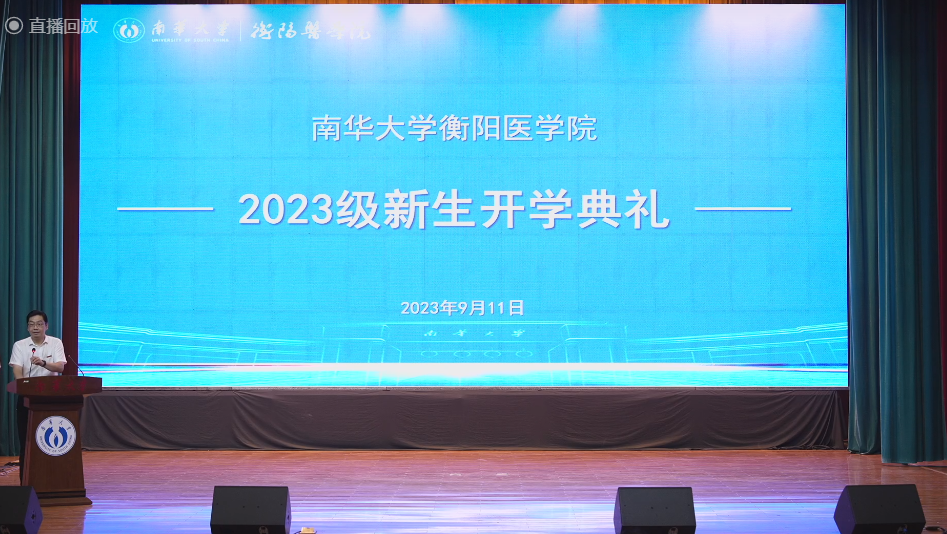 9月11日下午,南华大学衡阳医学院2023级新生开学典礼于南校大会堂隆重举行。参加此次典礼的有特邀嘉宾、中国工程院院士、中南大学临床药理研究所所长周宏灏教授,南华大学党委委员、副校长、衡阳医学院院长王福俤教授,学院高层次人才代表,医科类学院、附属医院(临床学院)领导,教师代表,医科类学院2023级本科生班主任、2023级新生辅导员,在校生代表、医科学院、临床学院2023级全体本科生、研究生共2265人。开学典礼采用线上与线下相结合的方式,在南华楼教室和北校活动中心设立了6个分会场同步直播,共有2.9万人观看直播,1.9万人点赞。院党委书记曾国主持本次典礼。